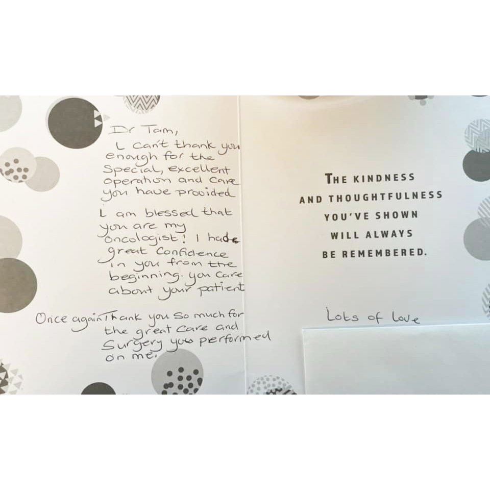 “I wanted you to know that I am very happy with your surgery and in fact the radiography department where I have had another CT at yesterday said what a great job you have done!... I am very grateful I had you as my surgeon.”