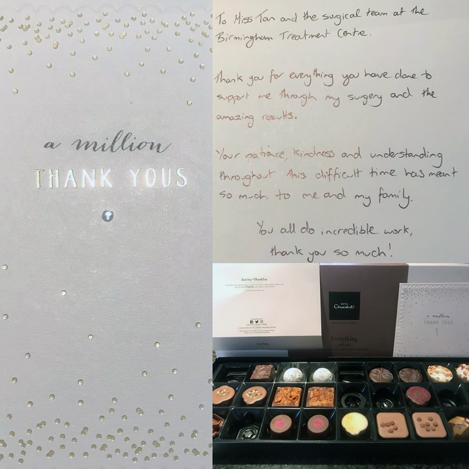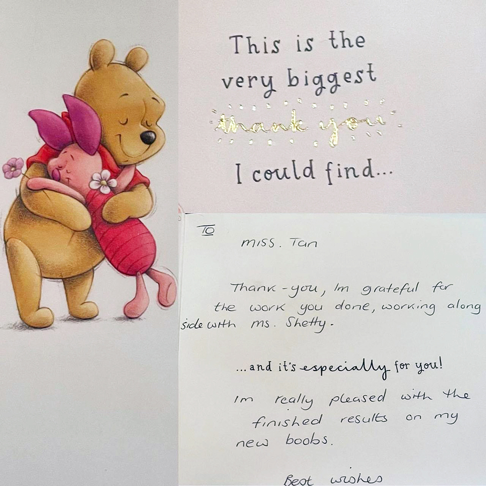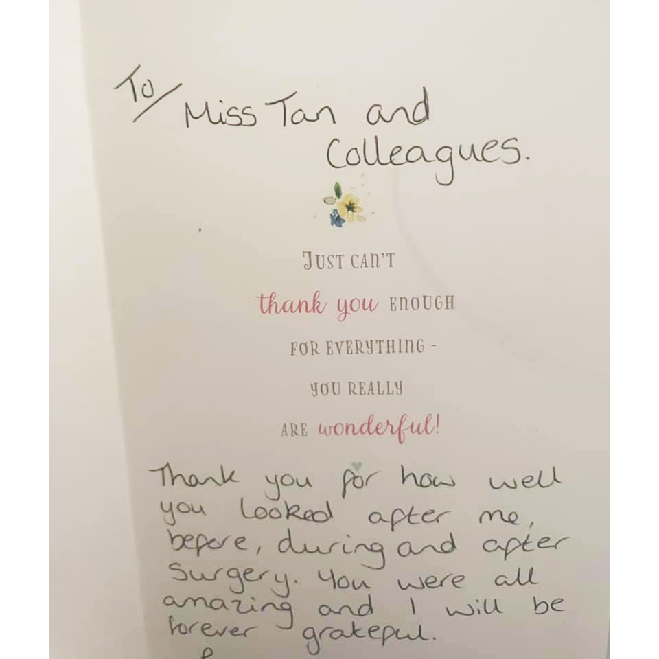 “Miss Tan and her colleagues went above and beyond. An excellent surgeon, friendly, supportive and encouraging. Bedside manner tremendous.”